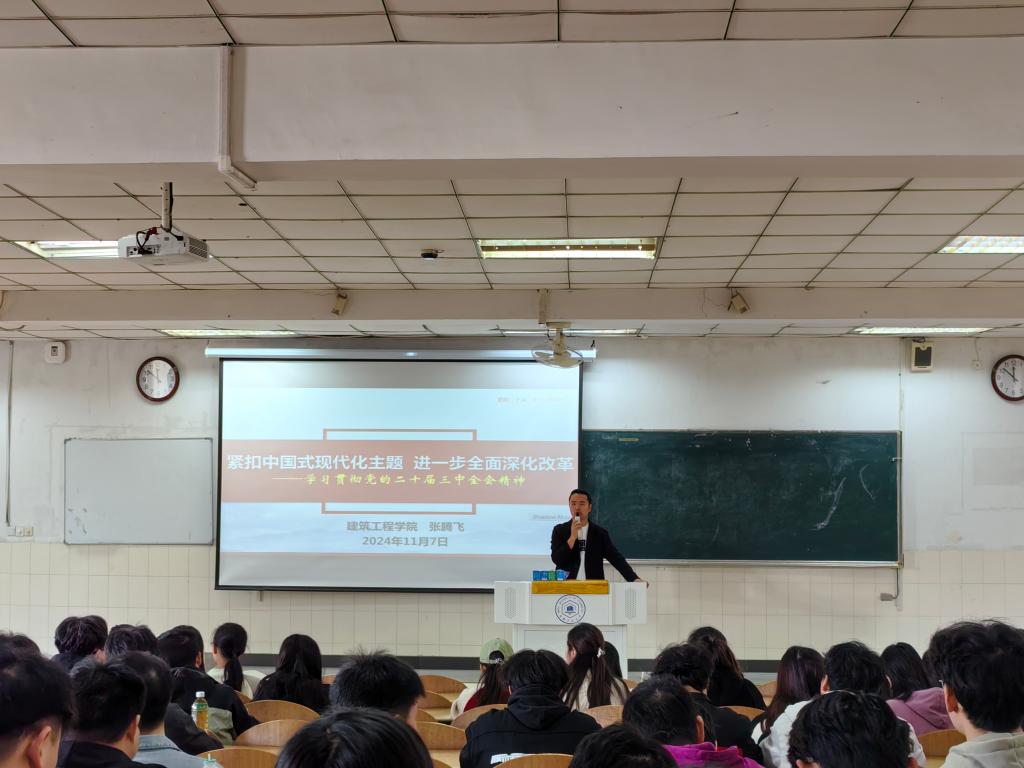 宣讲会上,张腾飞以《紧扣中国式现代化主题进一步全面深化改革——学习贯彻党的二十届三中全会精神》为题,从这次全会是在以中国式现代化全面推进强国建设、民族复兴伟业的关键时期召开的一次十分重要的会议、深入学习领会习近平总书记在全会上的重要讲话精神、全面准确理解《决定》提出的进一步全面深化改革重大举措以及全力以赴抓好全会精神贯彻落实等四个方面,并结合学院学科专业特色,对党的二十届三中全会进行了系统阐释和深入解读。他勉励同学们要坚定理想信念,强化理论武装;要发扬奋斗精神,提高综合素质;要强化使命担当,争做时代新人,努力做党的二十届三中全会精神的学习者、宣传者、实践者。