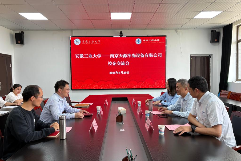 交流会上,张虎对企业的到访表示热烈欢迎,并重点介绍了学院学科建设、科研特色及人才培养成果。他指出,建环系作为学院重点学科之一,长期致力于绿色建筑技术、智慧能源系统等方向的研究,与天源冷冻在制冷节能、低碳技术等领域具有高度契合点。刘粉明详细介绍了企业发展历程、核心业务及技术优势。作为国内冷冻设备领域的知名企业,天源冷冻深耕制冷系统研发与节能技术创新,近年来在冷链物流、工业制冷等领域取得多项突破。随后,双方围绕共建实习基地、联合技术研发、职业能力培训等方面开展深入探讨。