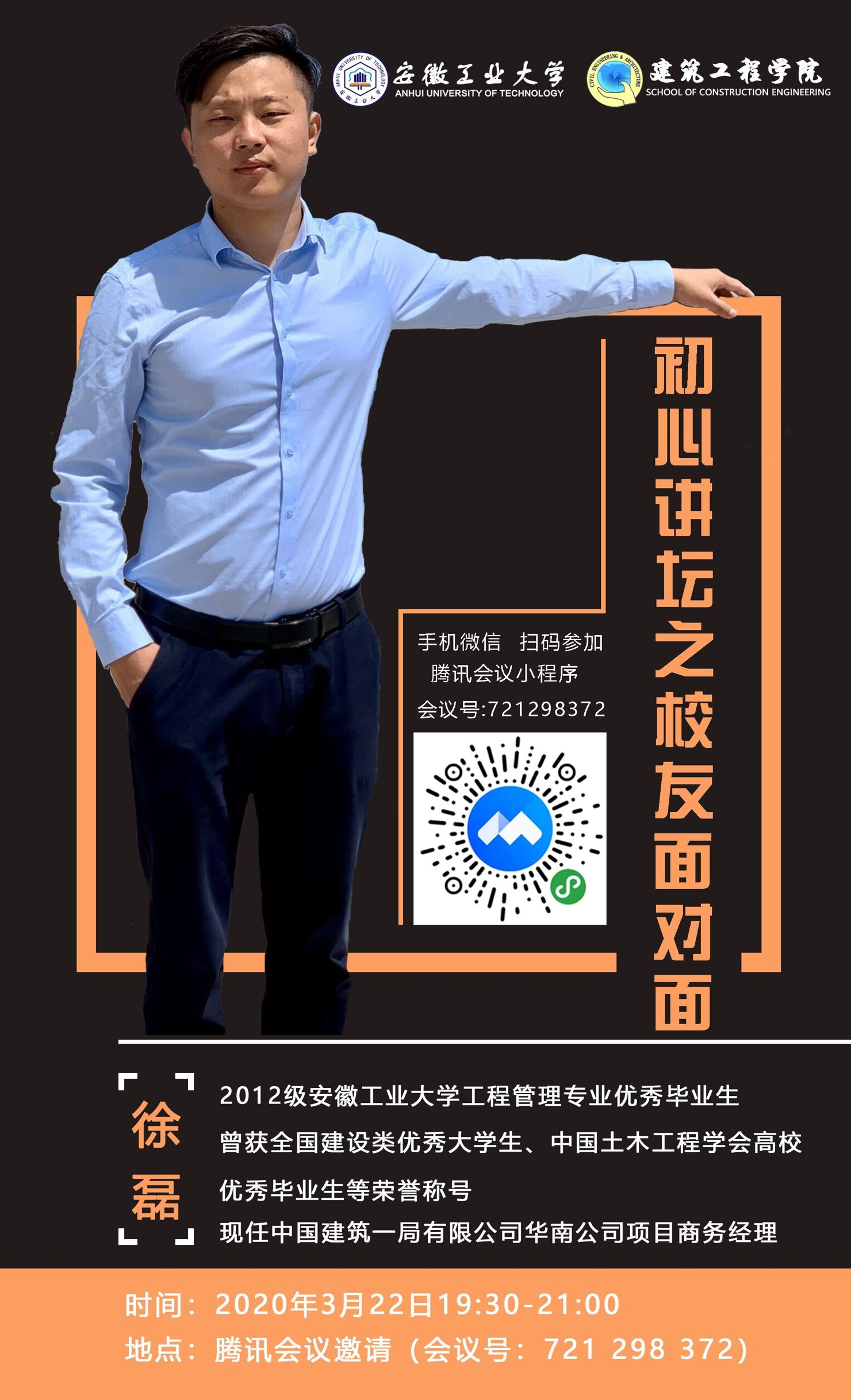 为提升学生的生涯规划能力,提高就业竞争力,切实整合资源,发挥校友在疫情防控期间的育人作用,建工学院根据学校2020届毕业生就业工作安排,面向学院毕业生开展“初心讲坛之校友面对面”系列线上分享会。3月23日,首期分享会在“腾讯会议”平台开讲,课程邀请了2012级工程管理专业校友徐磊、包容、周健、李旭4名毕业生主讲。分享会由建工学院毕业班辅导员赵颖虹主持,工程管理系主任吕忠老师以及100余名学生参加了本次云端交流。